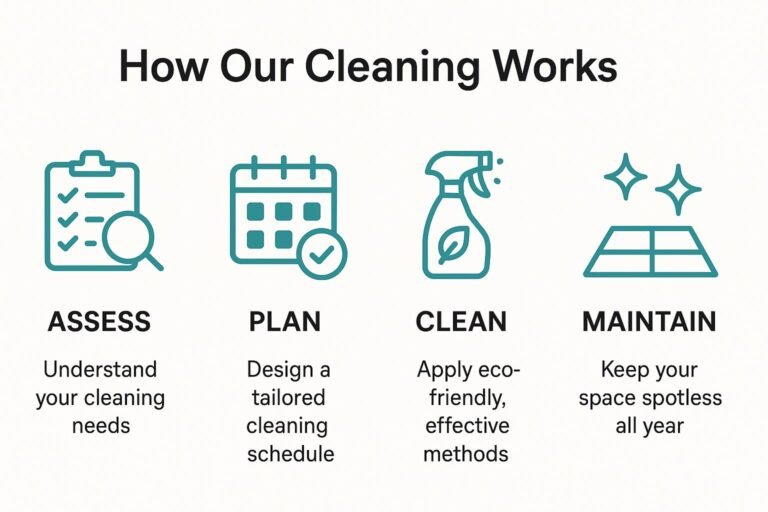 At Prime Pest and clean, we believe a spotless space starts with a smart plan. Our proven four-step process ensures your home or workplace not only looks clean but stays clean all year. We assess your needs, design a customised schedule, apply eco-friendly methods, and maintain perfection with ongoing care.